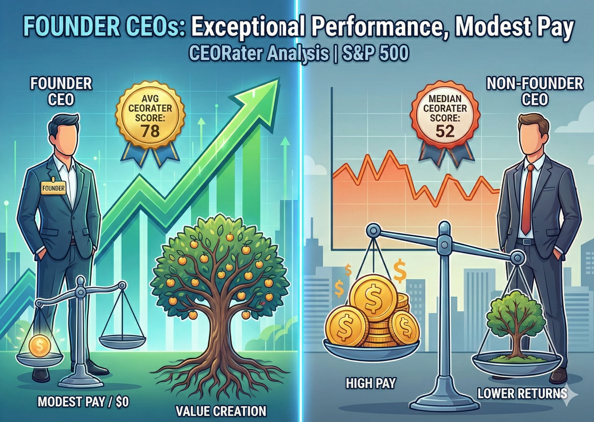Founder CEOs achieve an average CEORaterScore of 78, dramatically above the median CEORaterScore of 52 for all S&P 500 CEOs. Yet Founder compensation tells a fascinating story of restraint and alignment.